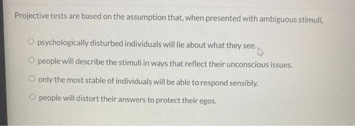 Projective tests are based on the assumption that when presented with ambiguous stimuli O psychologically disturbed individuals will lie about what they see. Individual attitudes characteristics and behavior patterns are.